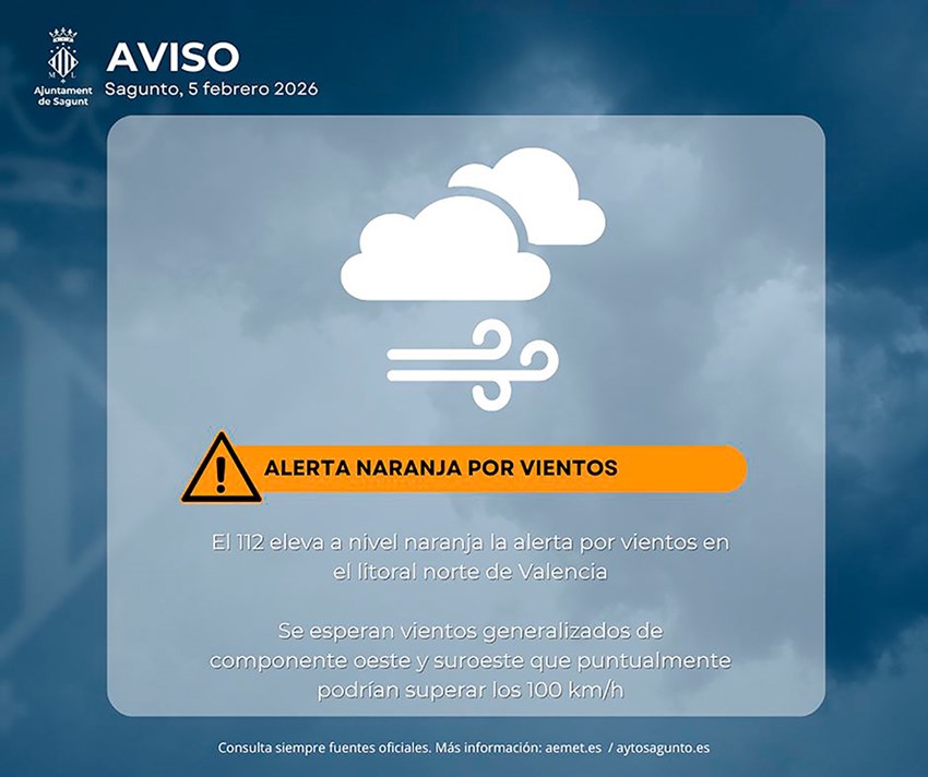 Desde el Ayuntamiento de Sagunto se recuerda a la ciudadanía algunas de las recomendaciones que, por una mayor seguridad, cabe seguir en estas situaciones de alerta por fuertes rachas de viento, como son extremar las precauciones e informarse en tiempo real de los avisos oficiales del Ayuntamiento de Sagunto, AEMET y el 112 CV.