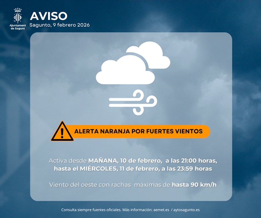 Desde el Ayuntamiento de Sagunto se recuerda a la ciudadanía algunas de las recomendaciones que, por una mayor seguridad, cabe seguir en estas situaciones de alerta por fuertes rachas de viento, como son extremar las precauciones e informarse en tiempo real de los avisos oficiales del Ayuntamiento de Sagunto, AEMET y el 112 CV.
